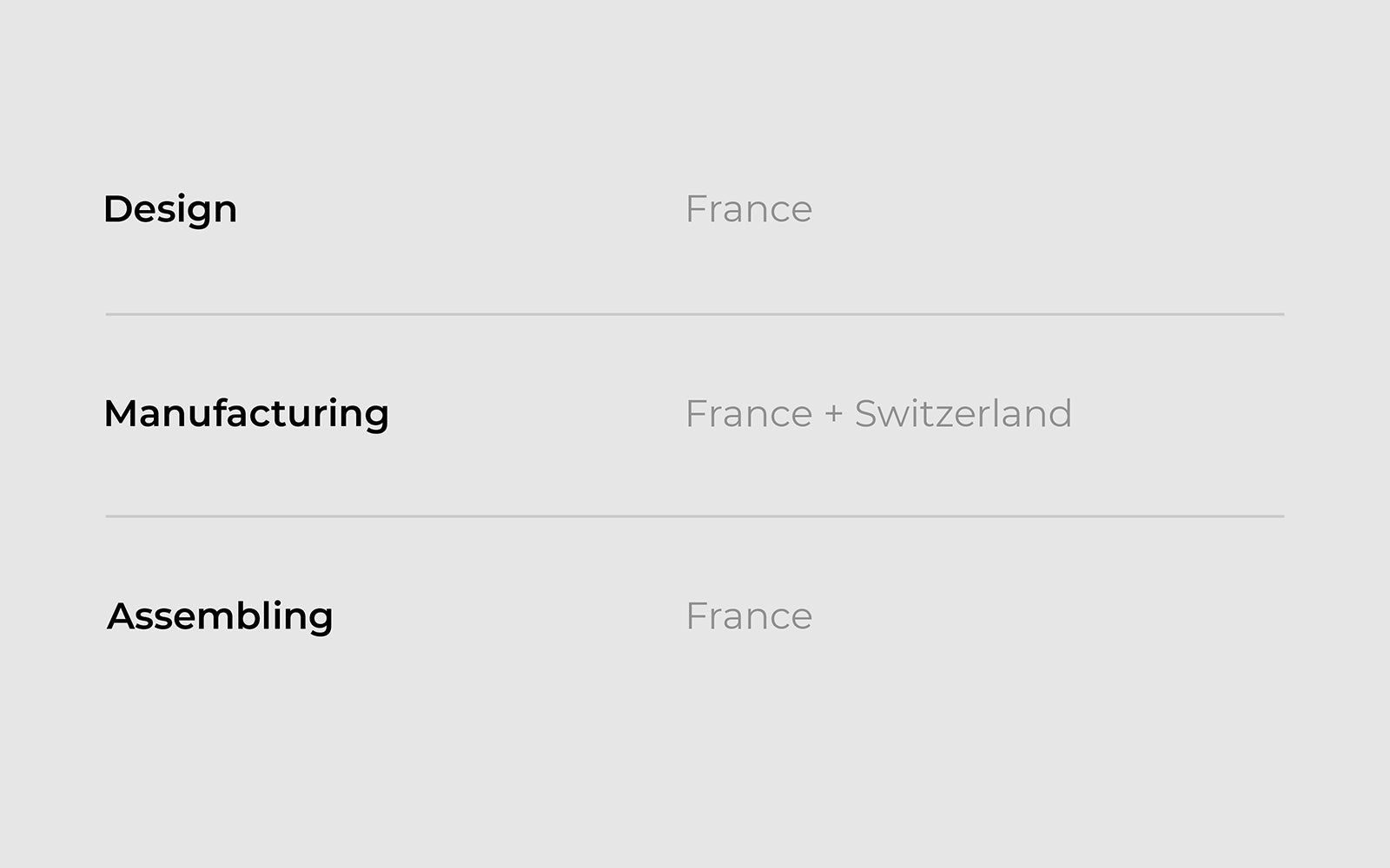 Premium mechanical in-house caliber designed and manufactured in our workshops in Morteau (France). All other components are sourced from Switzerland within a 70km radius of Morteau. Assemblies, calibrations and checks carried out by our watchmakers in our Morteau workshops.