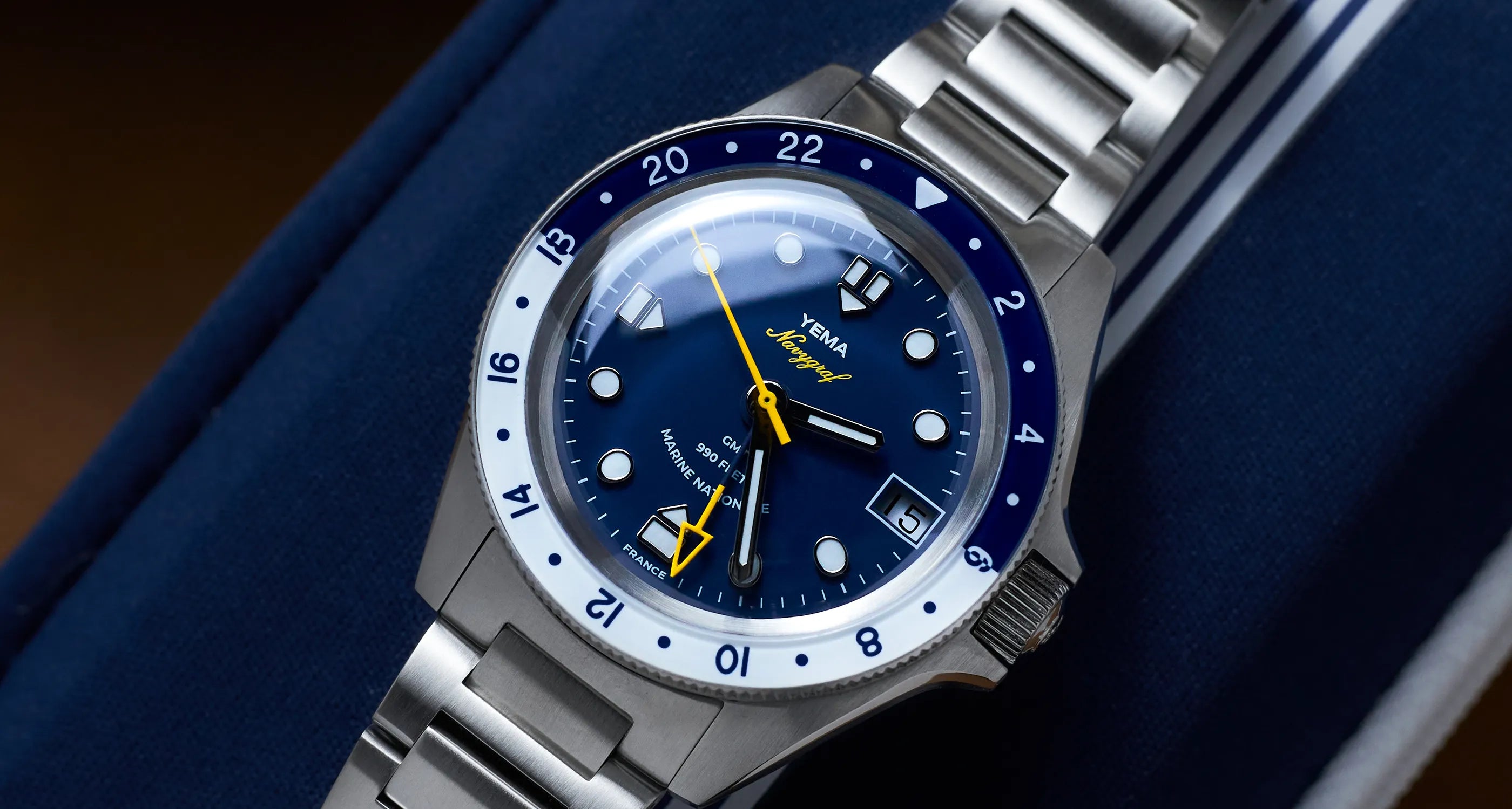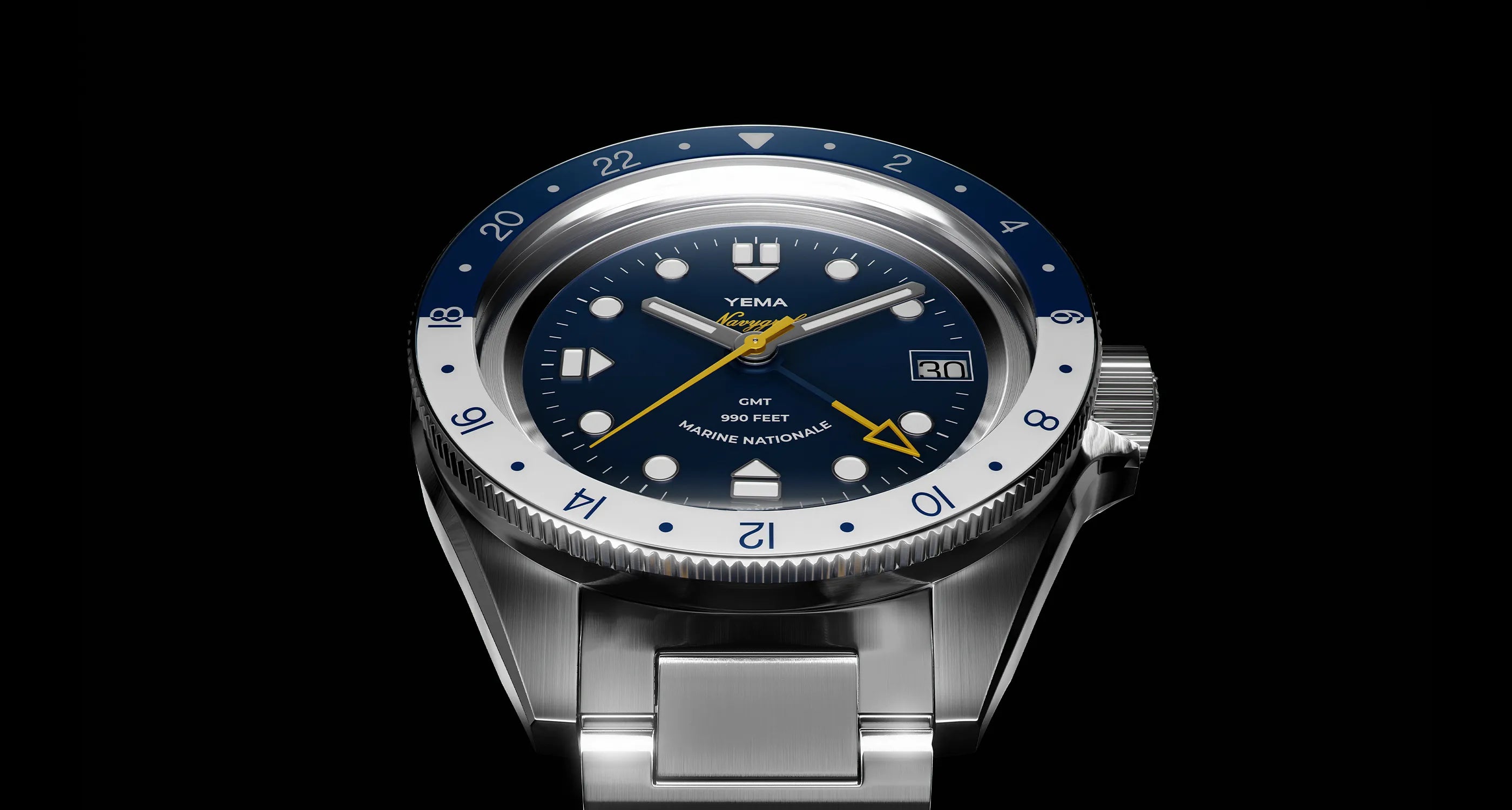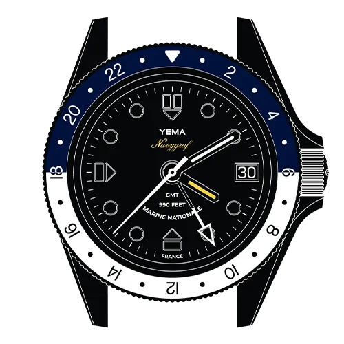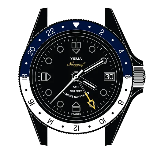 The dial inspires from the 1970s Navygraf II and features raised hour markers in polished steel matching the hands and providing additional depth to the dial. The white hour markers and hands, in contrast with the Navy blue dial, ensure high readabilty in all circumstances. The sweeping hand, GMT hand and Navygraf's logo are gracefully highlighted in yellow. Official French Navy watch with Marine Nationale mention at 6 o'clock.
