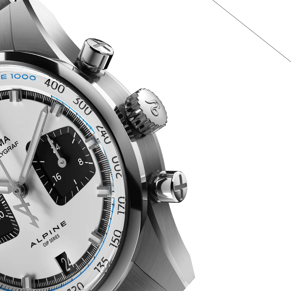 This timeless design not only enhances legibility, allowing each counter to be read at a glance, but also adds visual depth and sporty elegance. The date is balanced off at 6 o'clock position in tandem with the Alpine Elf Cup Series logo on the top to accentuate its racing theme. Spot the Alpine blue tip on the central second hand which points clearly to the bezel marked with the tachymeter scale.
