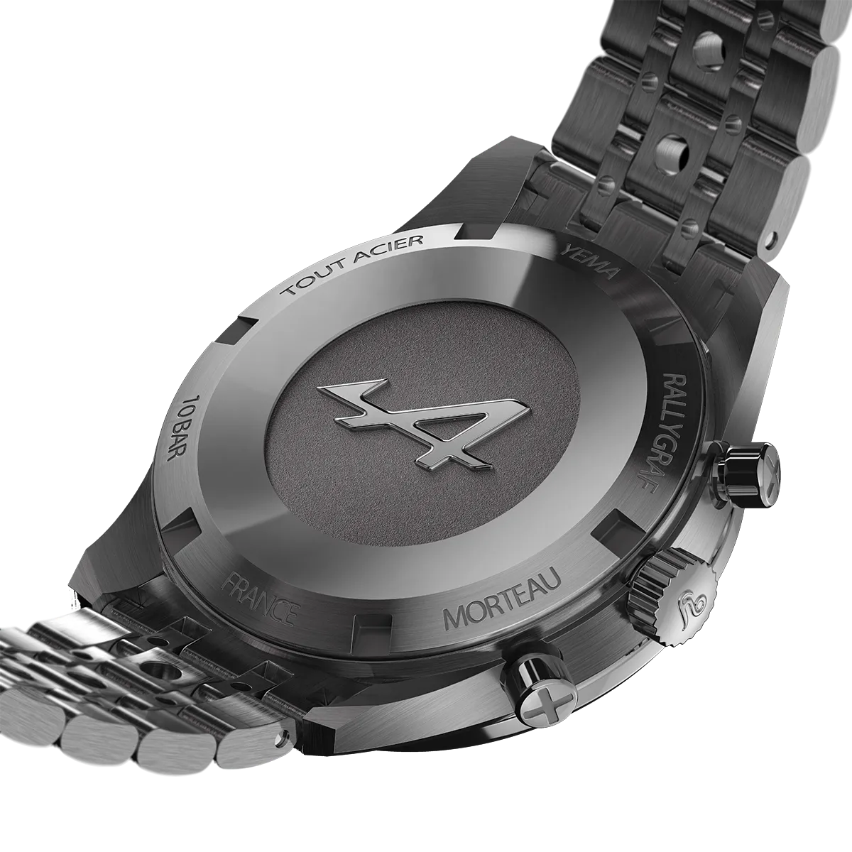 Specially conceived for the Rallygraf Alpine Elf Cup Series, the YEMA Rally steel bracelet stands out with its distinctive perforated design, inspired by vintage motorsport racing gloves. Crafted entirely from stainless steel in brushed finish, it blends sporty character and neo-vintage charm, perfectly complementing the chronograph’s racing DNA. The bracelet gently tapers toward the clasp for enhanced comfort and a more elegant wrist presence, while its integrated steel folding clasp has a safety catch for a secure and comfortable fit when wearing.