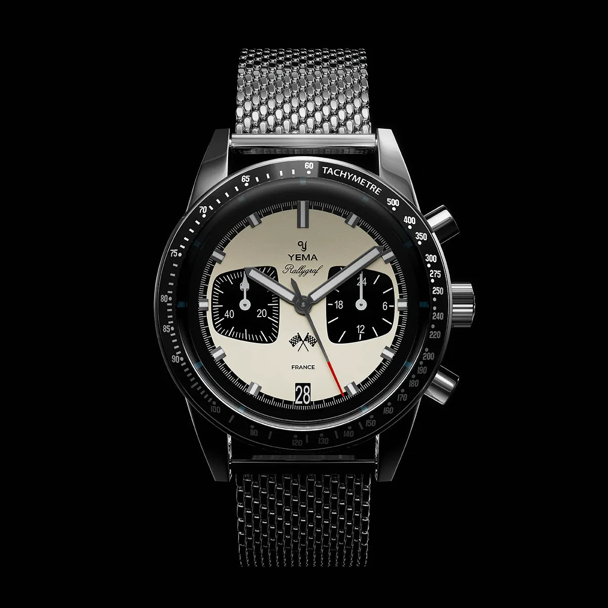 The Rallygraf's steel mesh bracelet is made in Milanese mesh for more flexibility and finesse. The clasp is engraved with YEMA's historic logo and adjusts quickly and very easily.