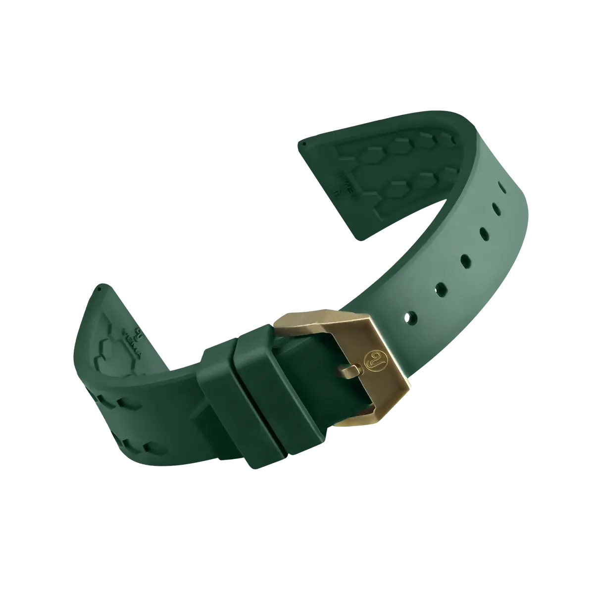 Specially designed for the Skin Diver Slim Bronze CMM.20, this FKM VITON® rubber strap has been conceived for intensive use in all extreme conditions thanks to its light, flexible, dust repellant and very resistant VITON® material. It features YEMA’s distinctive “Scales” finishing, a geometric relief pattern sculpted into the surface to create depth. This textured motif isn’t just aesthetic: it adds a more technical, tool-watch character while improving grip and reducing the “flat” look typical of plain rubber straps.