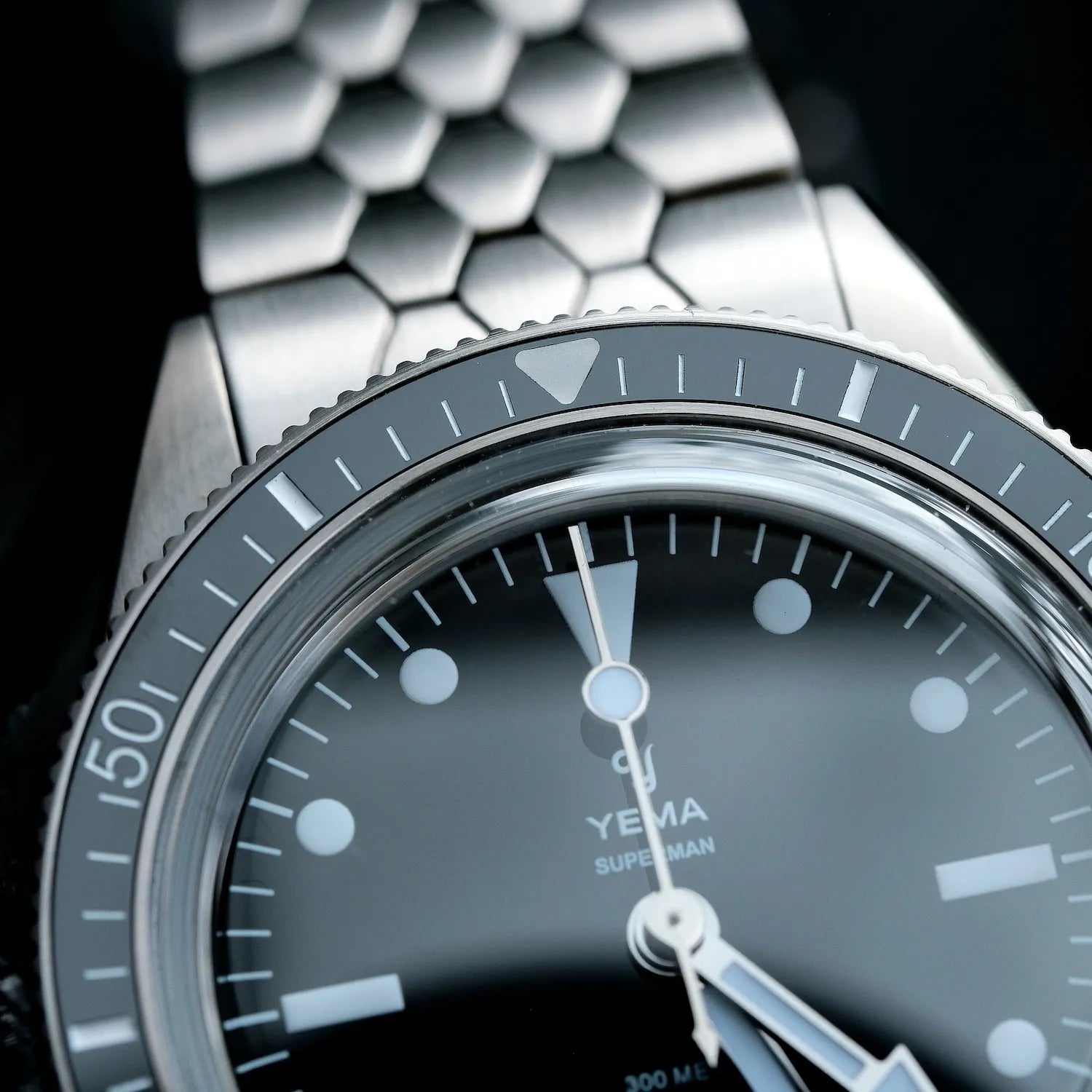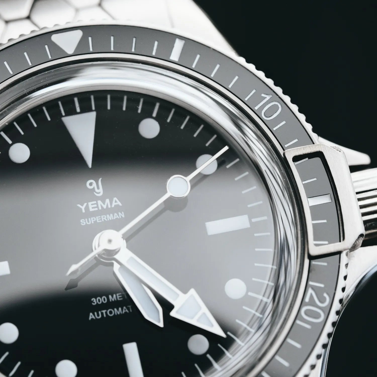 The iconic 1960s YEMA Scales bracelet has been slimmed down by 0.40mm so as to harmoniously integrate with the Superman Steel CMM.10 refined case.