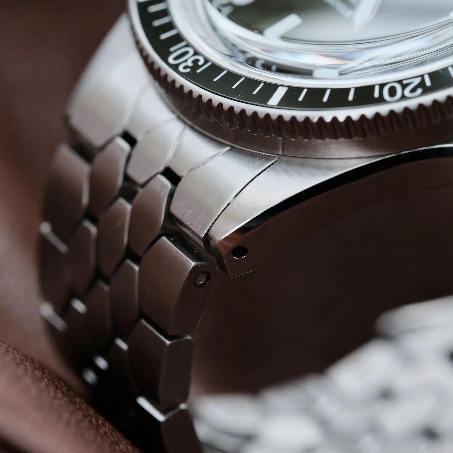 This new case also distinguishes by its elegant brushed surfaces with bevelled edges, mirror-polished for a striking contrast, preserving an unique neo-vintage appearance with all the advantages and functions of modern mechanical diving watches.