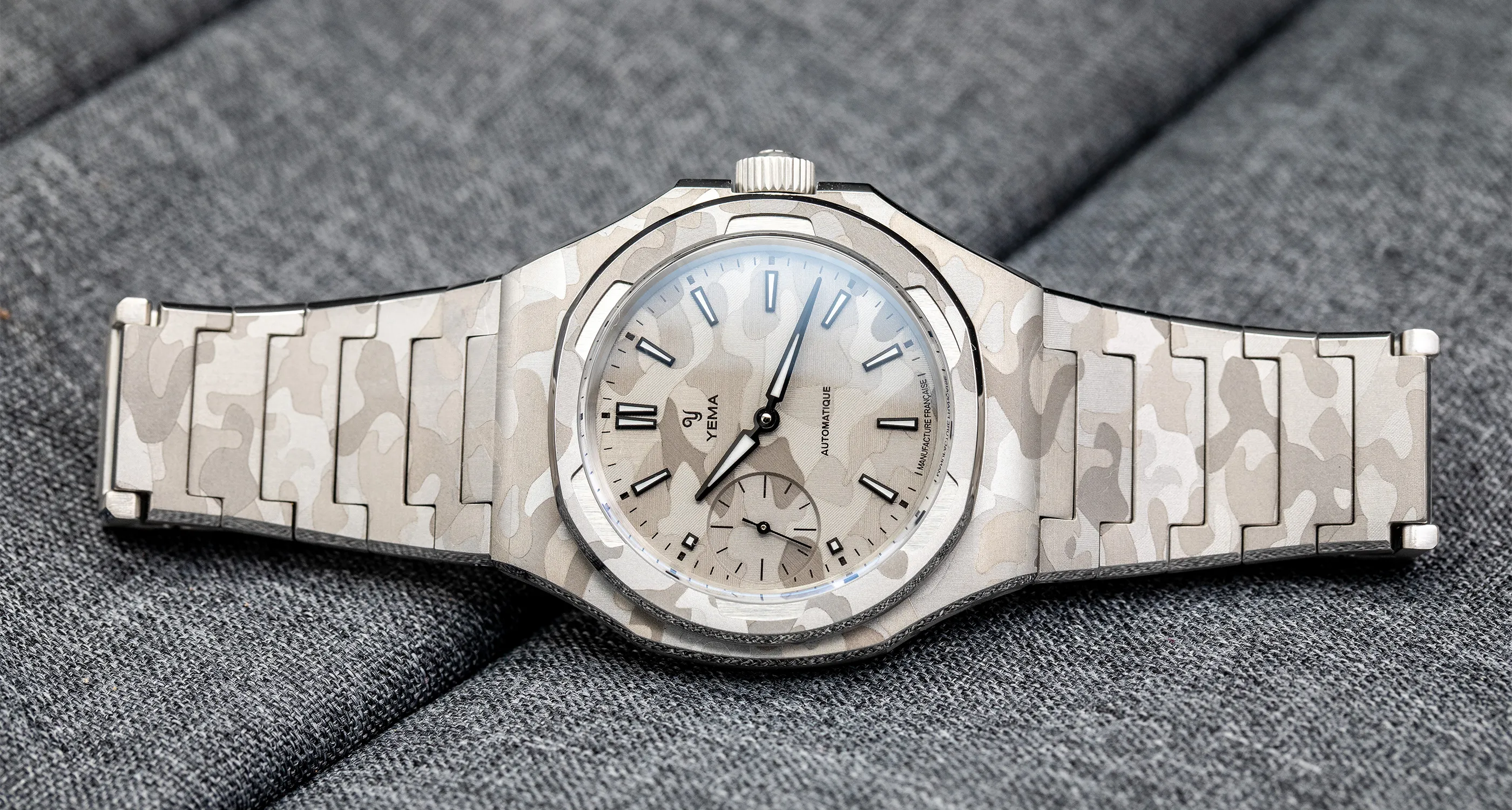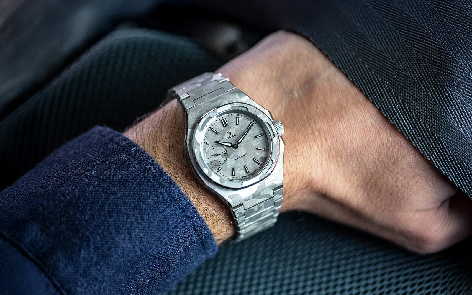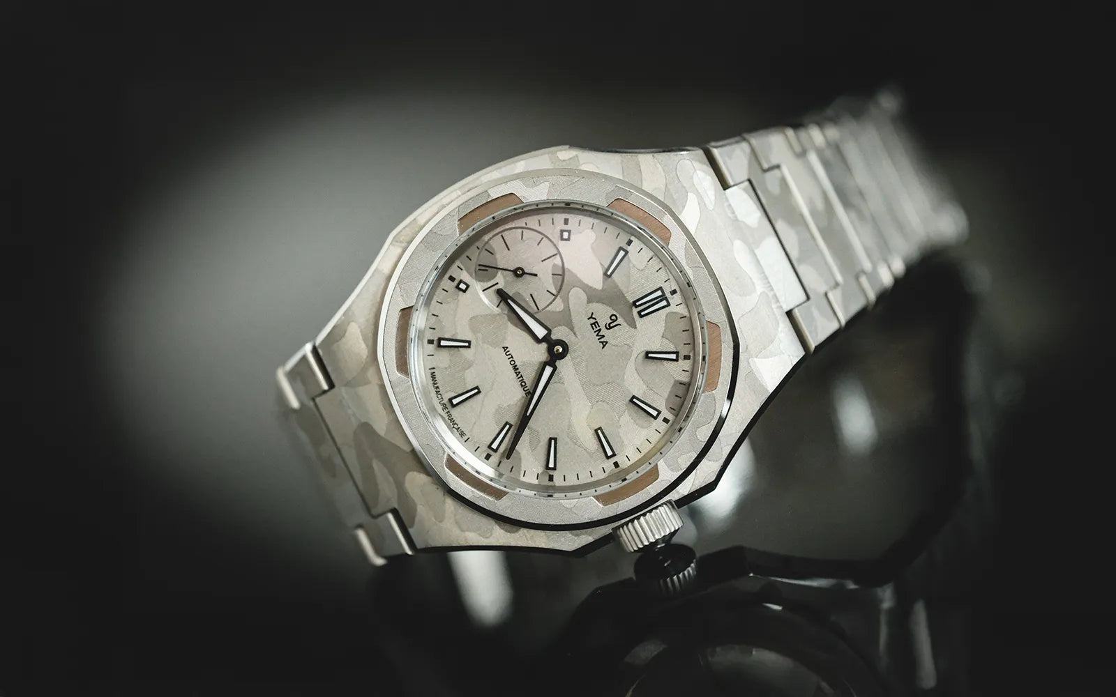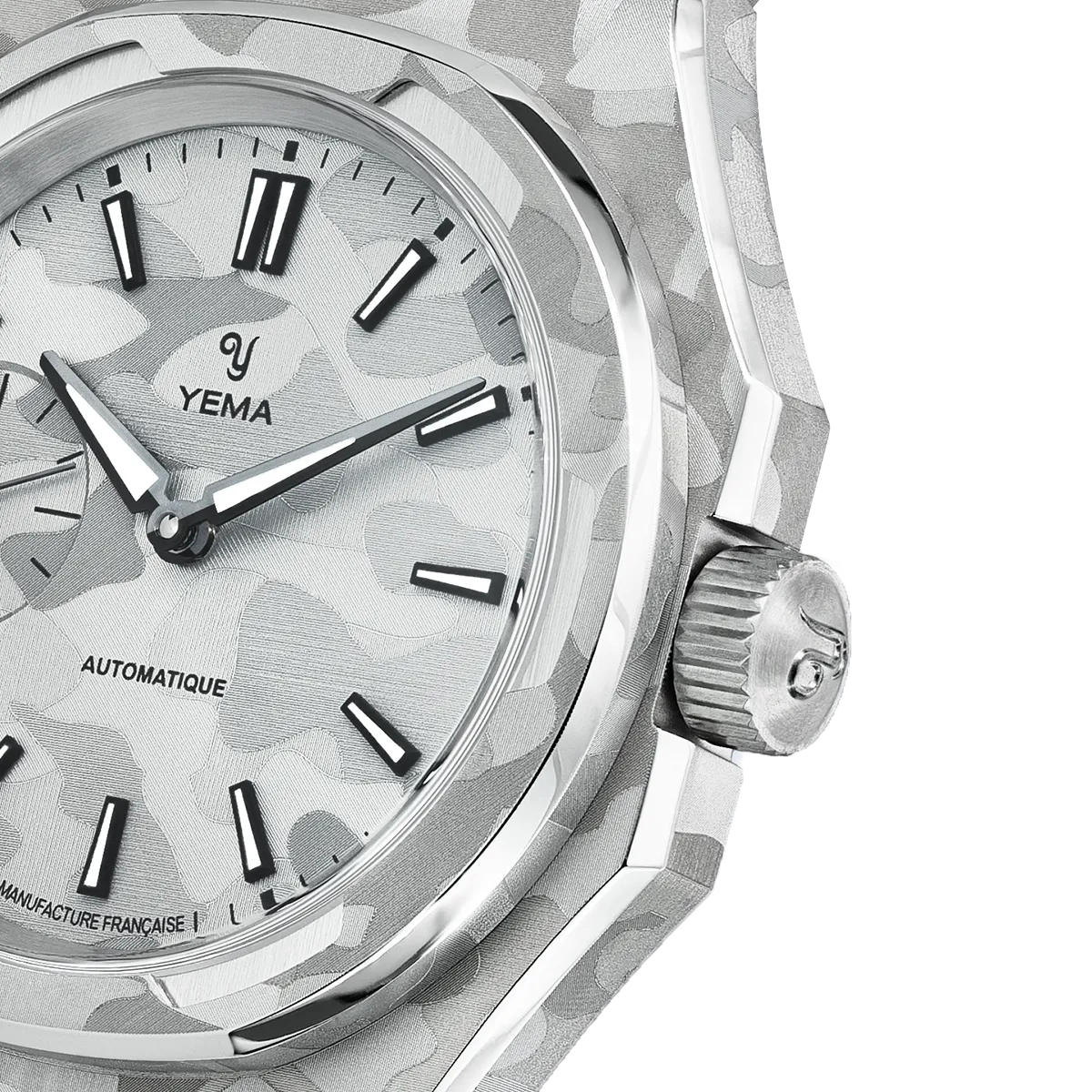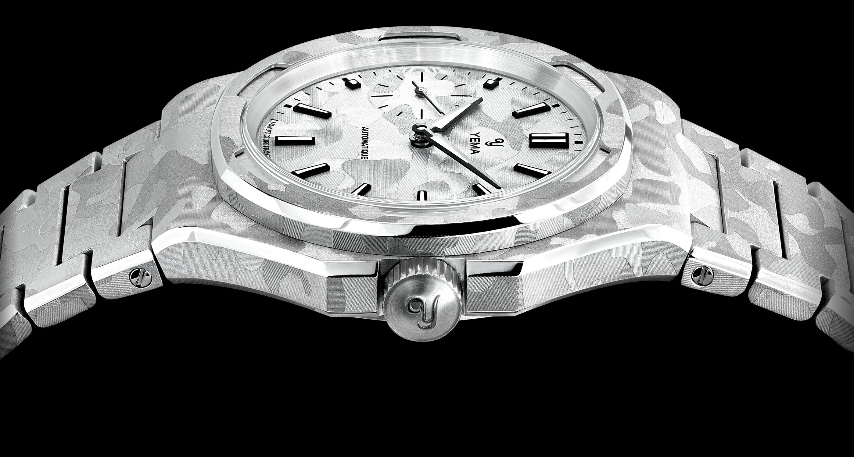 Inspired by a YEMA Sous-Marine bezel from the 1980s, the Wristmaster bezel frames the dial with strong geometry and refined finishing. On this edition, the bezel is also laser-finished with the snow camo motif, extending the design seamlessly beyond the dial. The result is a constant play of highlights and shadows, technical, architectural, and unmistakably Wristmaster.
