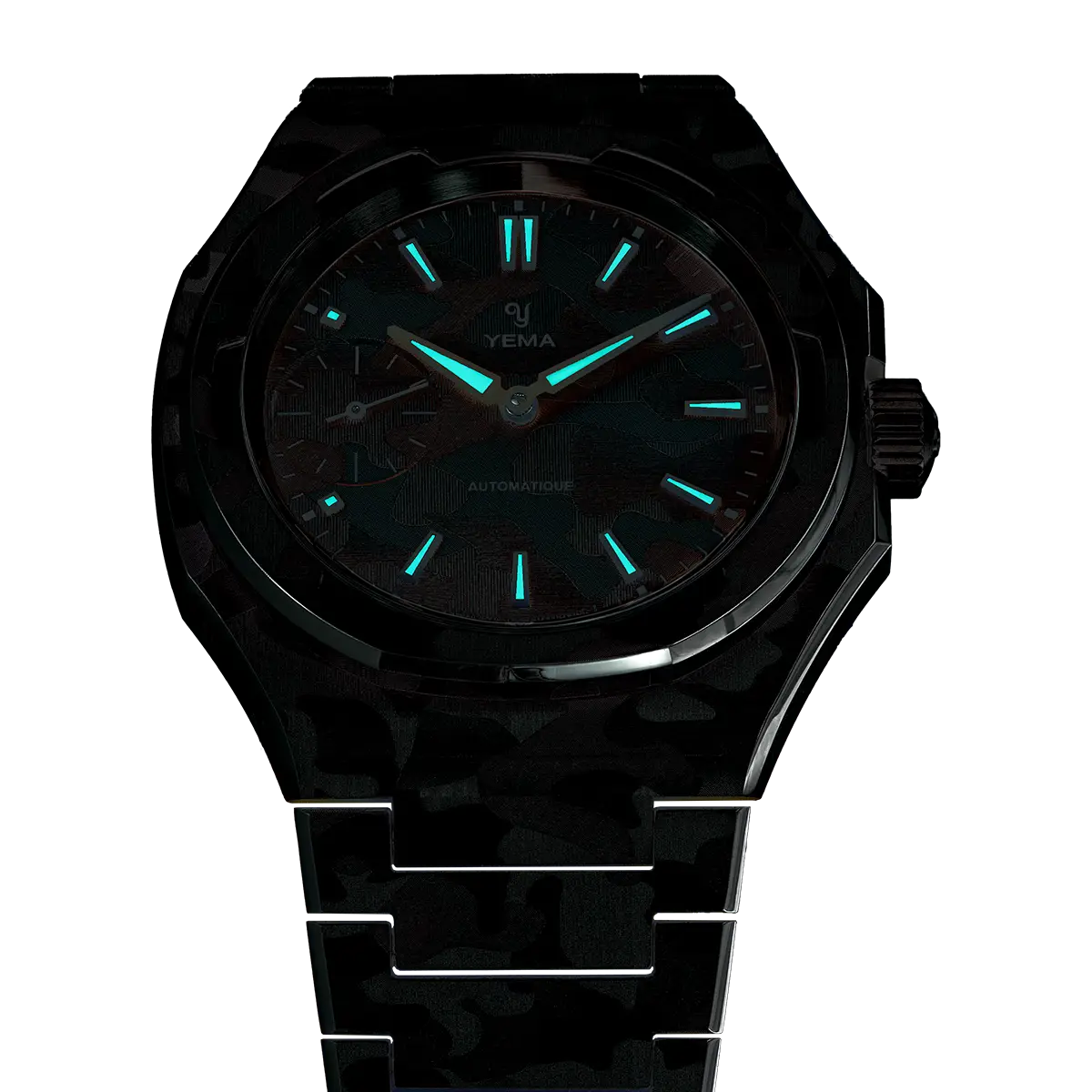The integrated bracelet continues the snow camo design across each link, reinforcing the “one-piece” identity of the watch. It tapers naturally to enhance comfort and balance, while the finishing transitions keep the bracelet lively in motion.
