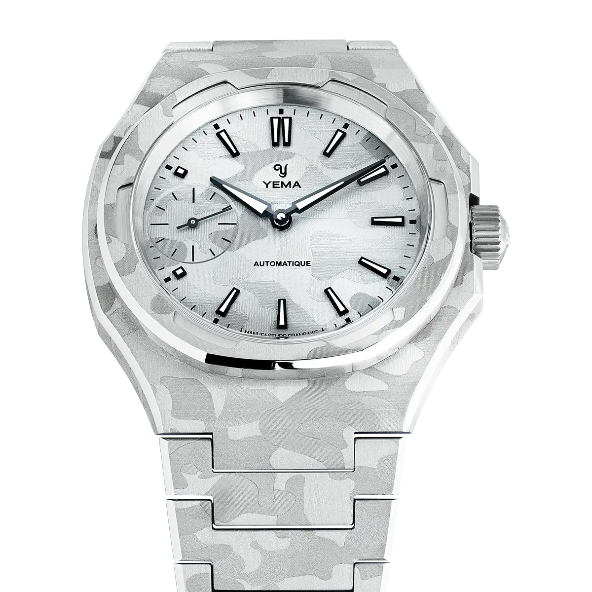 The 39mm steel case takes the form of an asymmetrical octagon, defined by multiple planes and crisp transitions. This complex geometry becomes the perfect surface for the snow camouflage execution, giving the watch a uniquely sculpted presence while preserving its sporty edge.