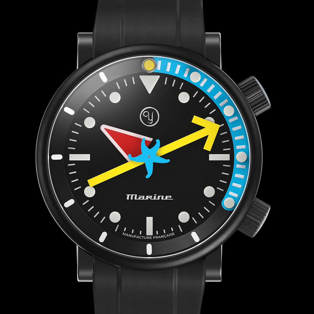 Alain Silberstein is known for his playful and colorful designs that blend art with horology. The black dial serves as a backdrop for a burst of vibrant and colorful geometric shapes: A bright red hour hand resembling a stylized triangle, a striking yellow minute hand shaped like an arrow, and a playful blue second hand in the form of a sea star.