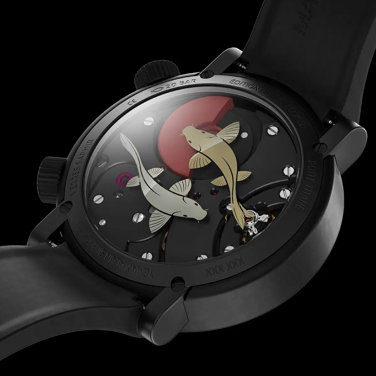 Each timepiece is delivered with two premium FKM rubber straps in black and red featuring a Grade 5 titanium deployant clasp with a black DLC microblasted finish.