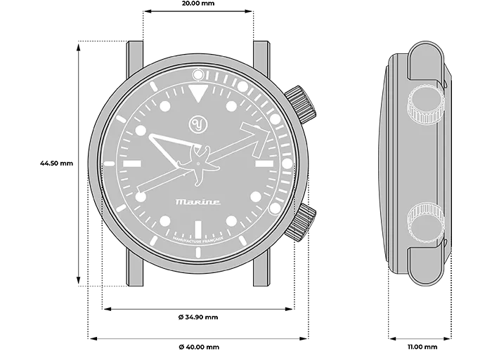 Premium mechanical in-house caliber designed and manufactured in our workshops in Morteau (France). All other components are sourced from Switzerland within a 70km radius of Morteau. Assemblies, calibrations and checks carried out by our watchmakers in our Morteau workshops.