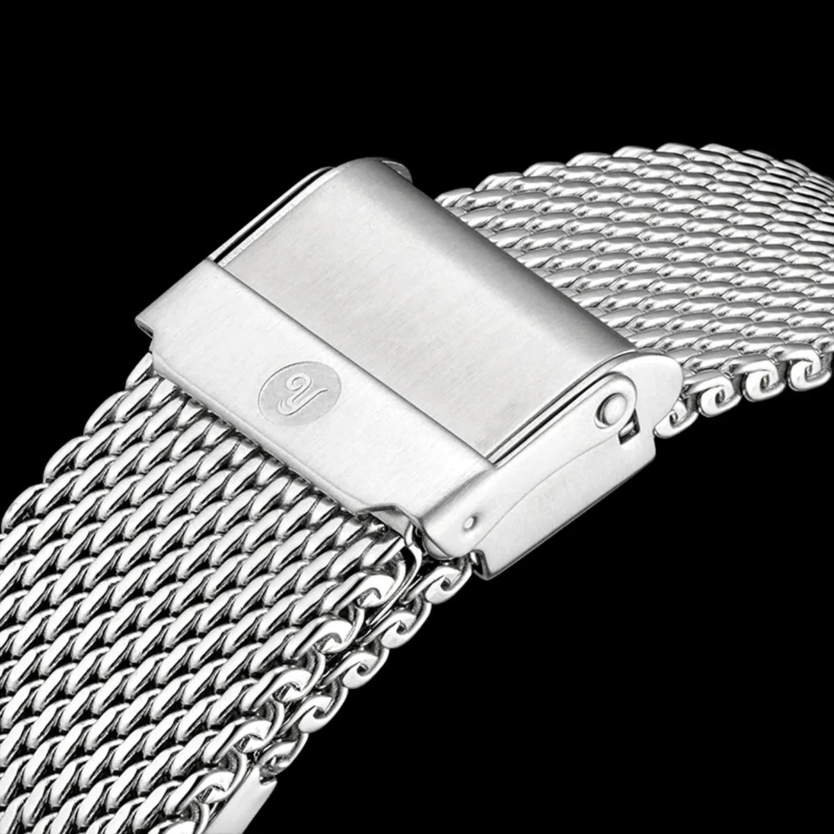 The Yachtingraf's steel bracelet is made in Milanese mesh for more flexibility and finesse. The clasp is engraved with YEMA's historic logo and adjusts quickly and very easily.