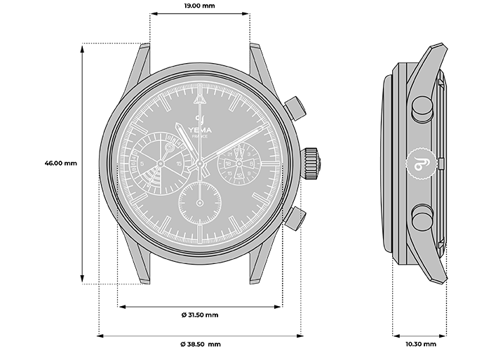 The case-back features YEMA's historic coat of arms, stamped with a hydraulic press in polished & brushed finish.