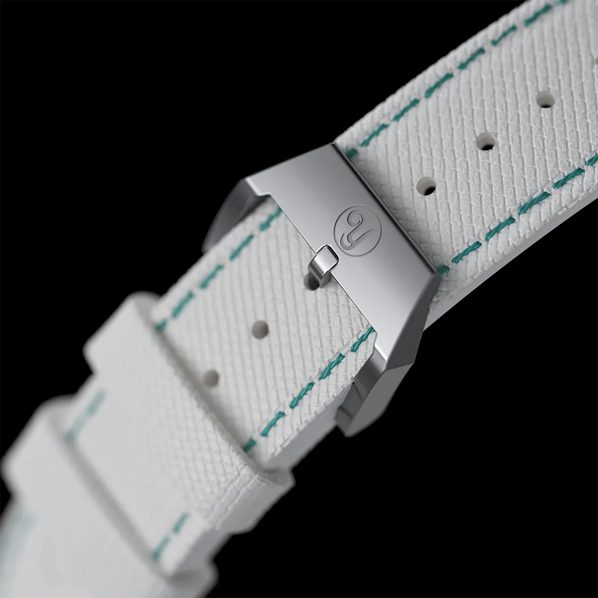 Made by a French manufacture of our region, the grained leather strap with stitches has been specially designed in the Yachtingraf's matching colours.